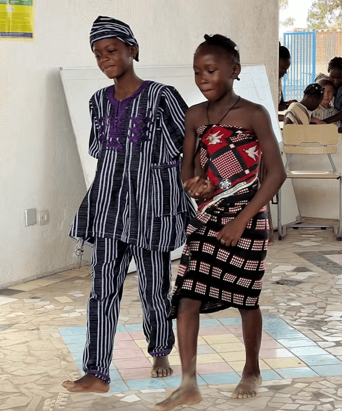 Paviljongen som byggdes förra året på högstadiet, har blivit Yennenga-verksamhetens mittpunkt. Där sker alla event, stora som små. Nu fylldes den av barn i fina traditionella kläder! De såg alla ut som små kungar och drottningar.